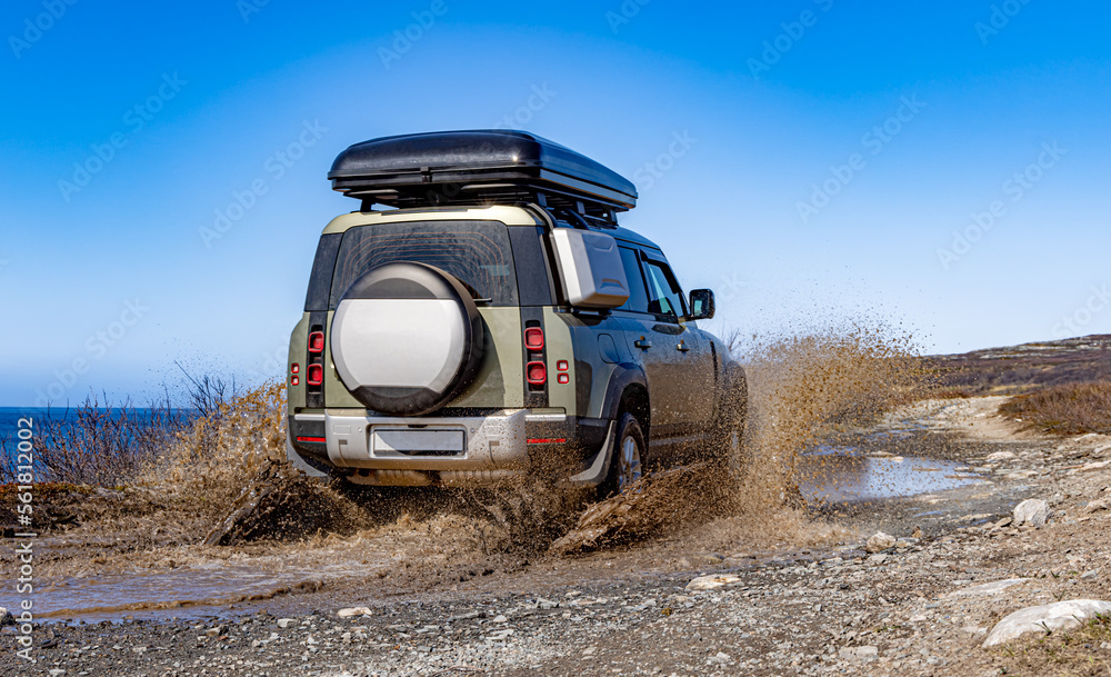 Off road tourist car rides off-road in the highlands. Expedition travel and vacation, adventures in remote areas.
