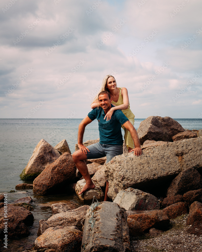 A girl in a yellow dress hugs a guy in blue shorts and a T-shirt. They stand by the rocks on the seashore, on a cloudy day.