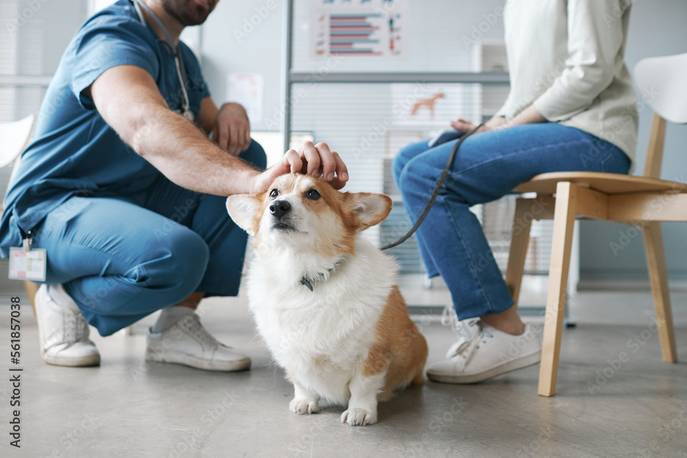 Corgi dog enjoying cuddle of vet doctor sitting on squats in front of pet owner