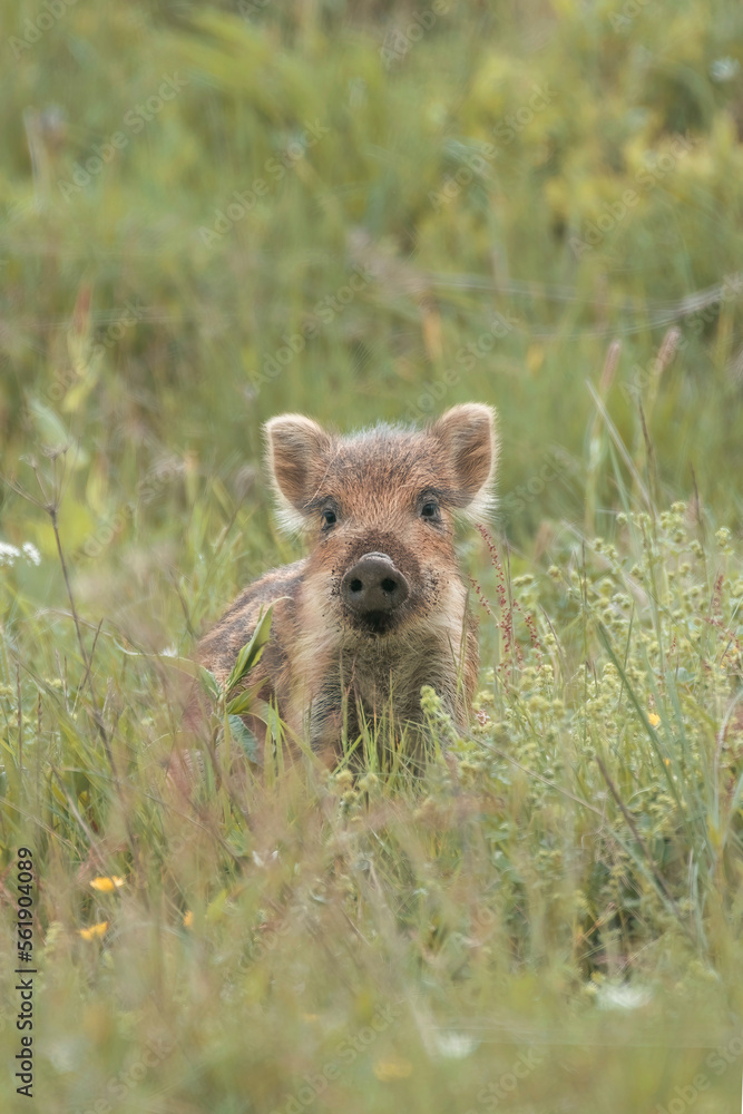 A cute wild boar cub (Sus scrofa) with a dirty snout arouses tenderness as it gazes at me in the flowering grass of an alpine meadow. Alps, Italy.