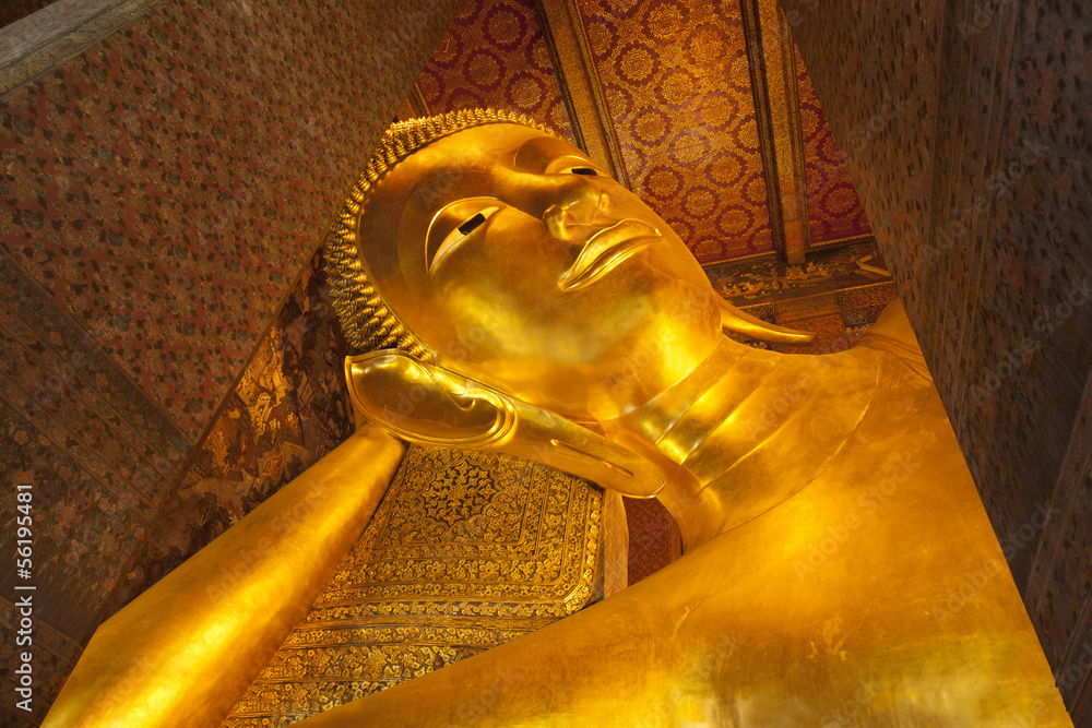 Reclining Buddha gold statue face. Wat Pho, Bangkok, Thailand