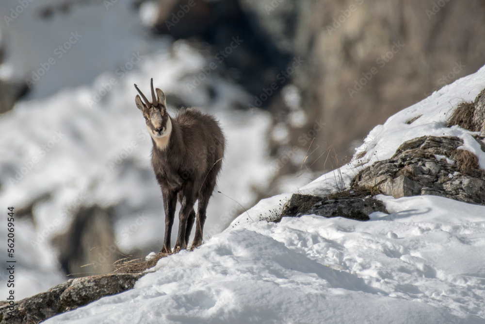 Alpine chamois (Rupicapra rupicapra) standing in a snowy alpine peak against snow meadow in the background, Alps, Italy.