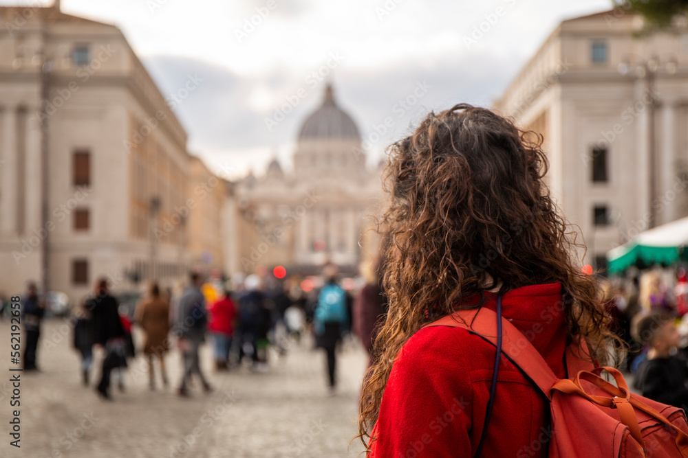 Woman in red coat looking at St. Peter's Basilica in Rome from the bridge that leads straight up to it