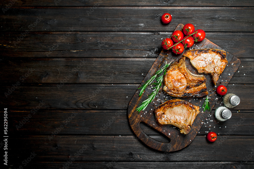 Grilled pork steaks with rosemary and fresh tomatoes.