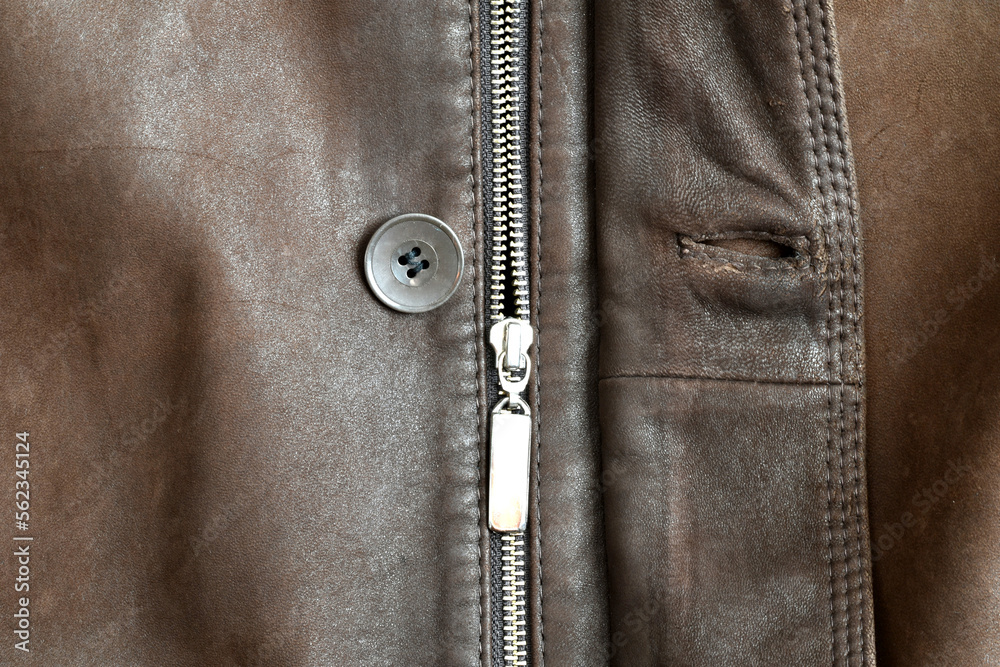 Metal zipper with lock and button. The zipper is sewn into the leather jacket.