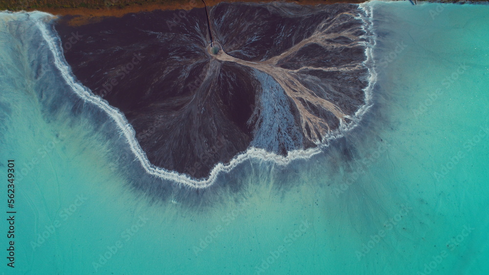 Top down aerial view over natural texture - abstract industrial lake water patterns. Turquoise waternature poluttion