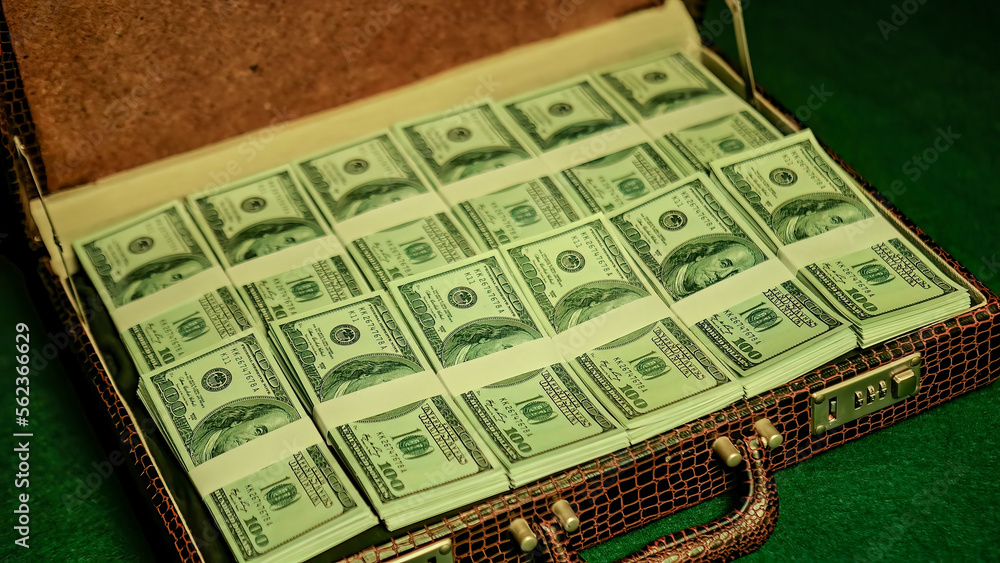 Man opens briefcase full of 100 dollars currency notes in a dimly lit nightclub