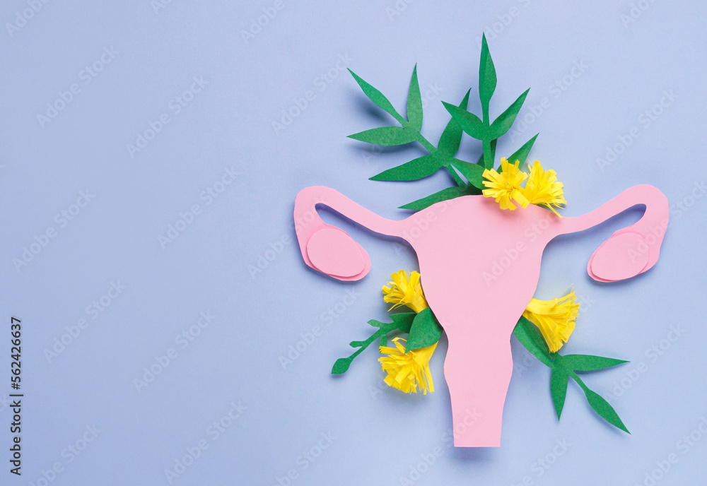 Woman's health. Paper uterus and flowers on light blue background, flat lay with space for text
