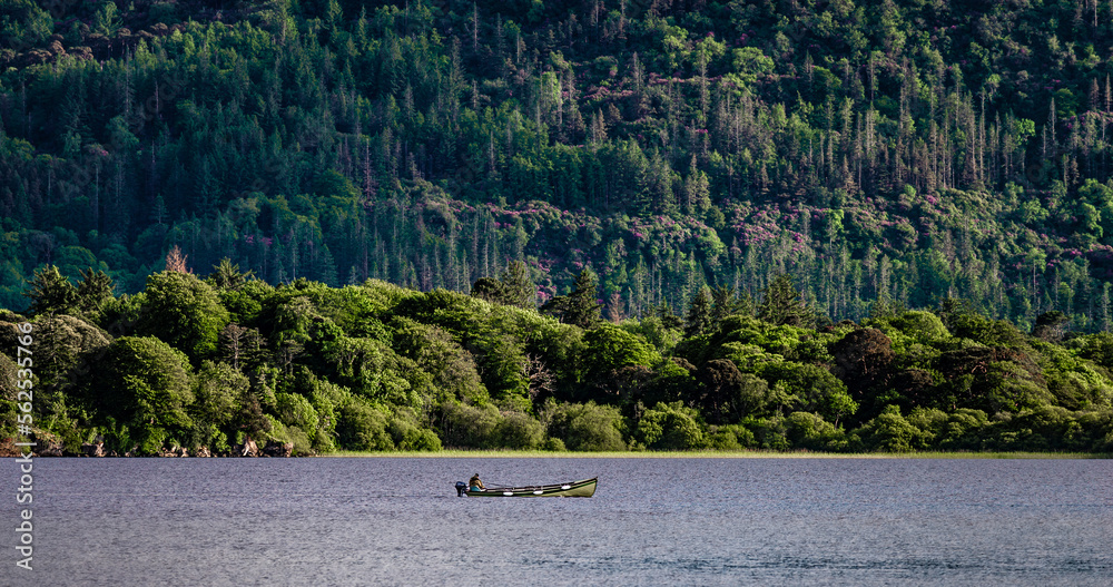 A lone fisherman fishing in a Lough Leane from a boat in Killarney National Park, Ring of Kerry, near the town of Killarney, County Kerry, Ireland