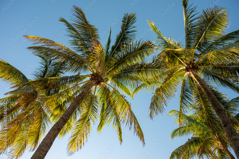 Coconut palm tree canopy in early morning light on Miami Beach, Florida on clear cloudless sunny morning.