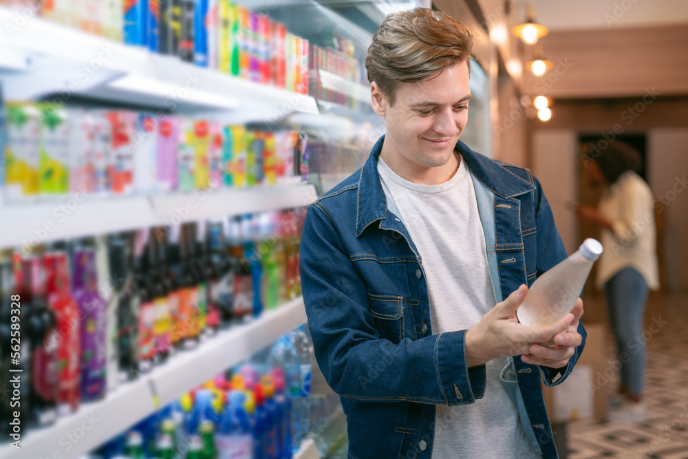 An European man but a bottle of mineral water from refrigerator cold in onvenience store