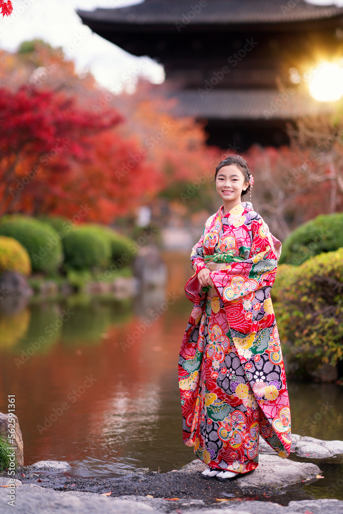 Japanese tourist girl in red Kimono traditional dress walking in walking street at Gion Temple area