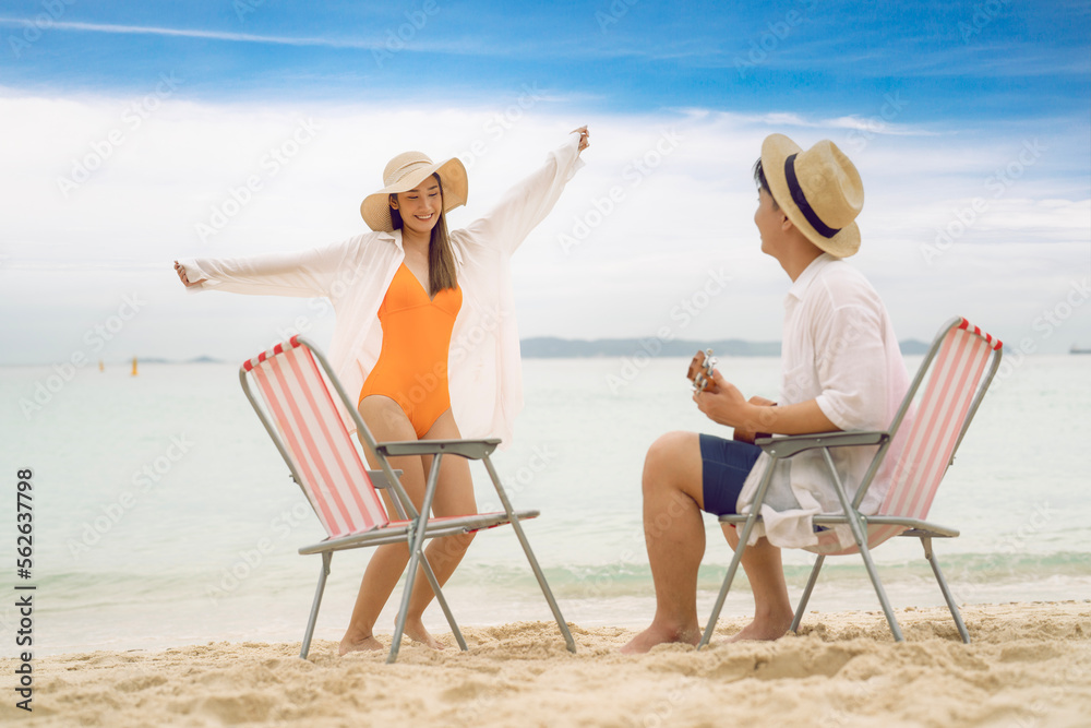Asian traveller couple sitting and see sunset togather on the beach with longtail boat background