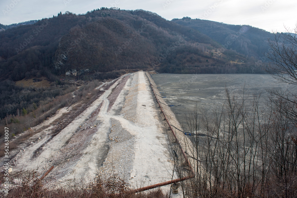 Barrier stopping the flow of copper and gold mining mining residuals into a settling basin, decantation lake