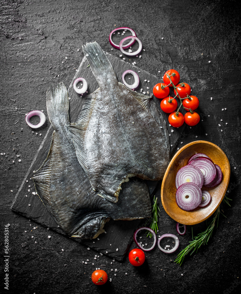 Raw flounder with cherry tomatoes and chopped onion in bowl.