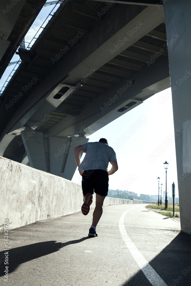rear view of a jogger running under a bridge