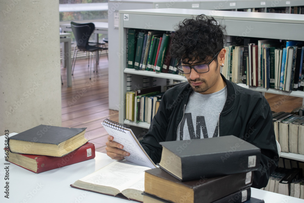 Estudiante con gafas y piercing leyendo y estudiando en la biblioteca