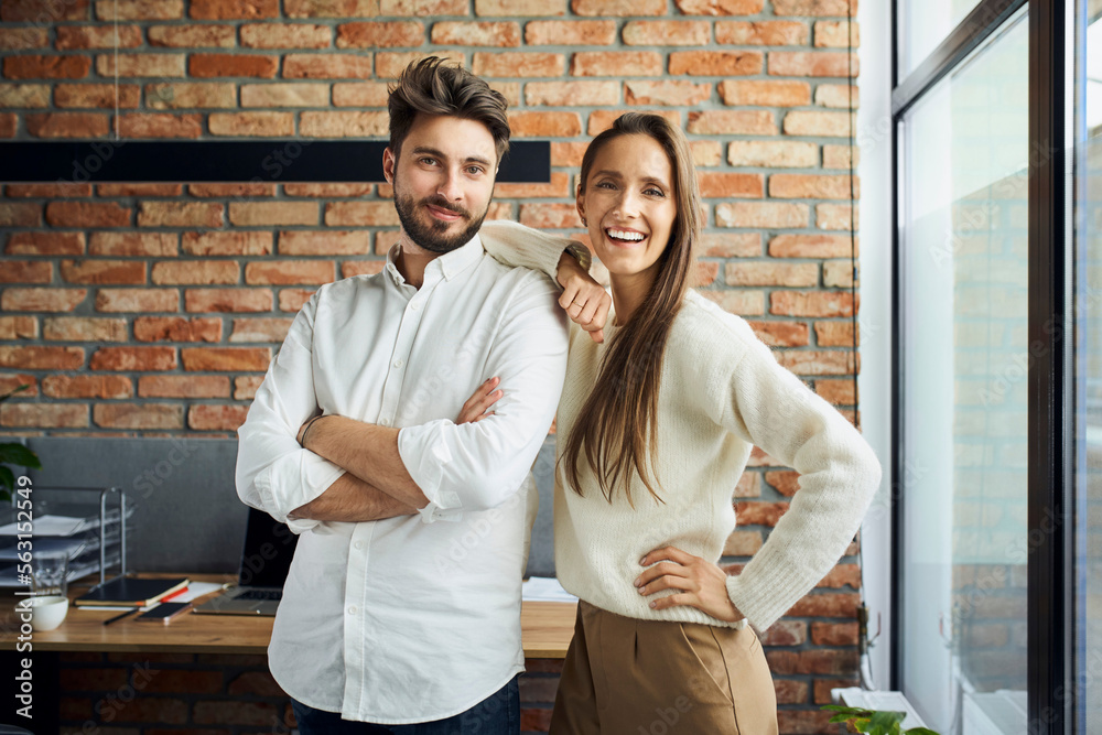 Portrait of successful couple standing at small office. Happy new business partners posing together