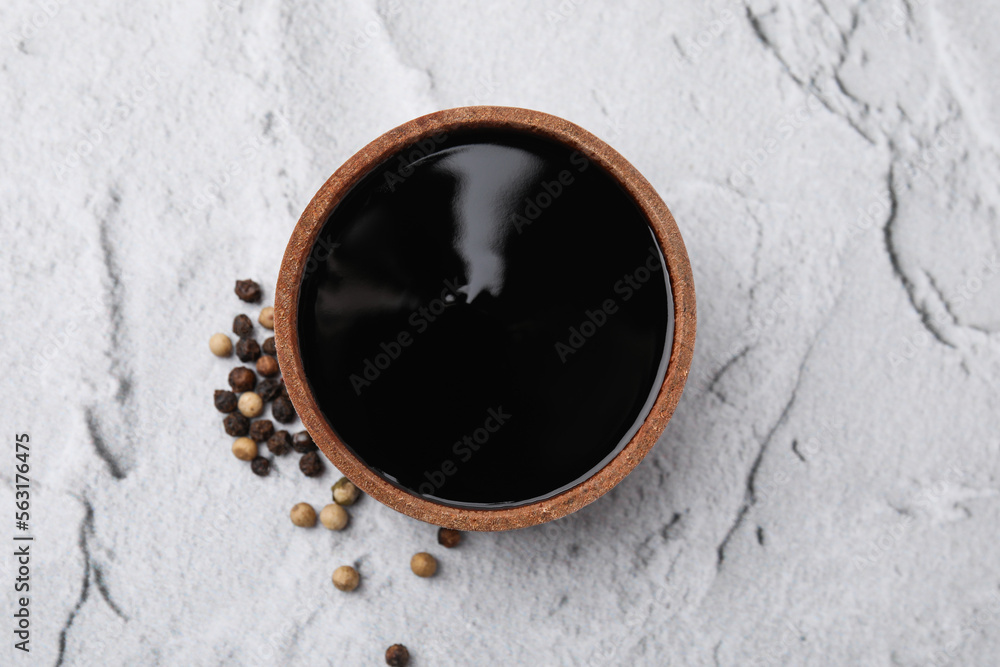 Wooden bowl with balsamic vinegar and peppercorns on white textured table, top view