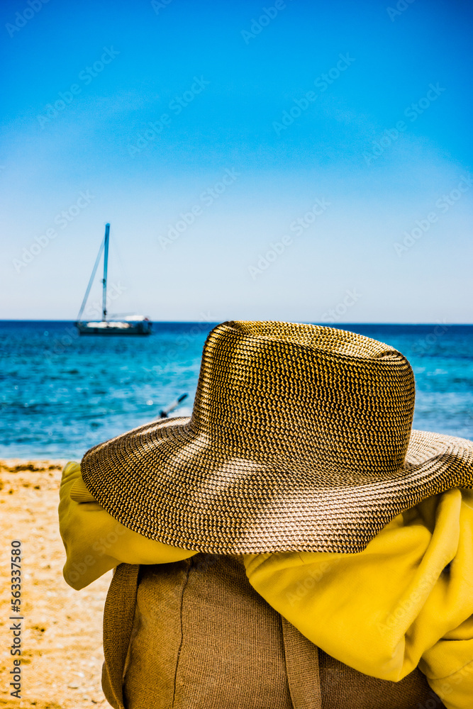 Un chapeau en paille est posé sur une chaise sur une plage en été devant une mer bleu turquoise , on devine un voilier au loin