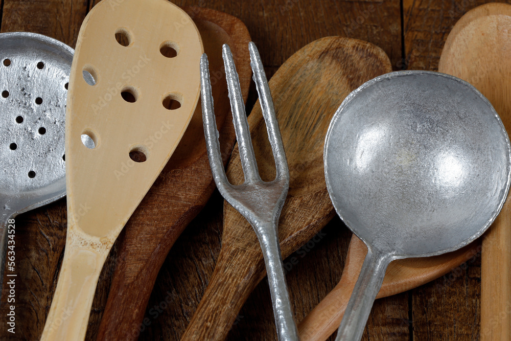 Wooden cutlery and cast aluminum cutlery on rustic wooden table. Traditional kitchen utensil in Brazil