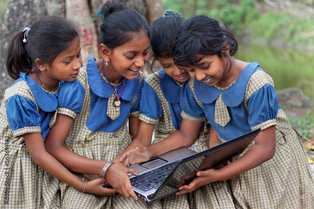 indian village government school girls operating laptop computer system at rural area in india