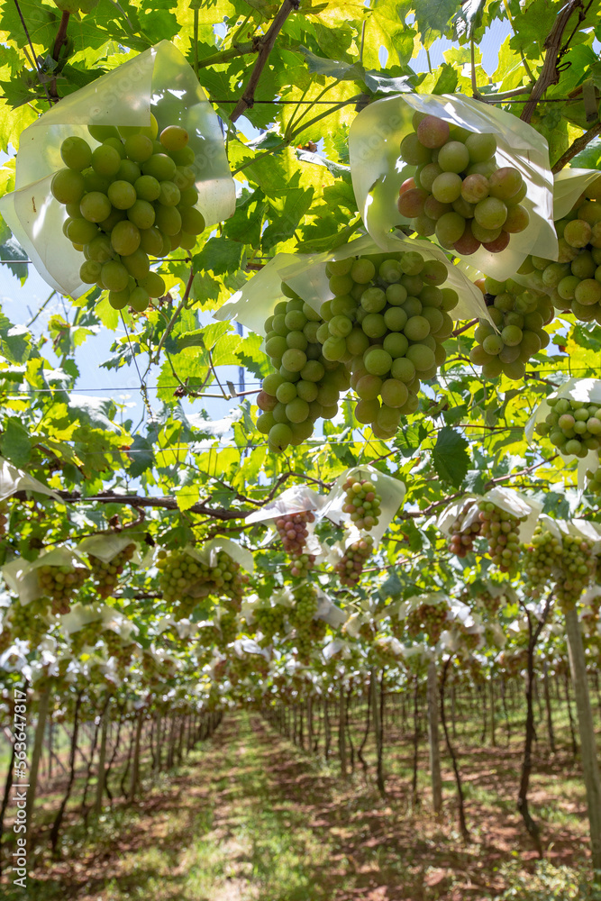 Detail of bunch of table grapes ripening on the vine. Brazil