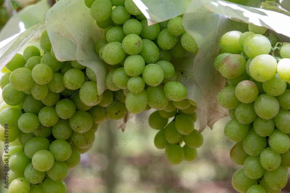 Detail of bunch of table grapes ripening on the vine. Brazil