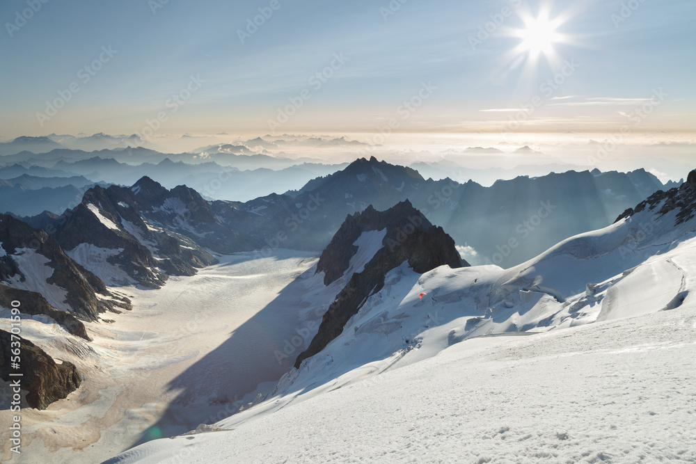 Panorama sur la Barre des Ecrins et les Alpes au lever de soleil en été depuis du Dôme des Ecrins, France