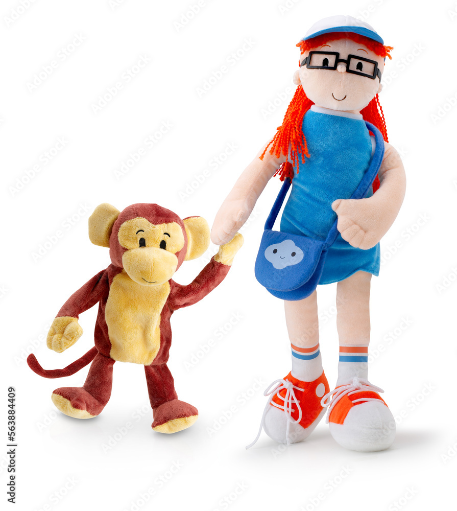 Niña y mono, muñecos de trapo sobre fondo blanco. Girl and monkey, rag dolls on white background.