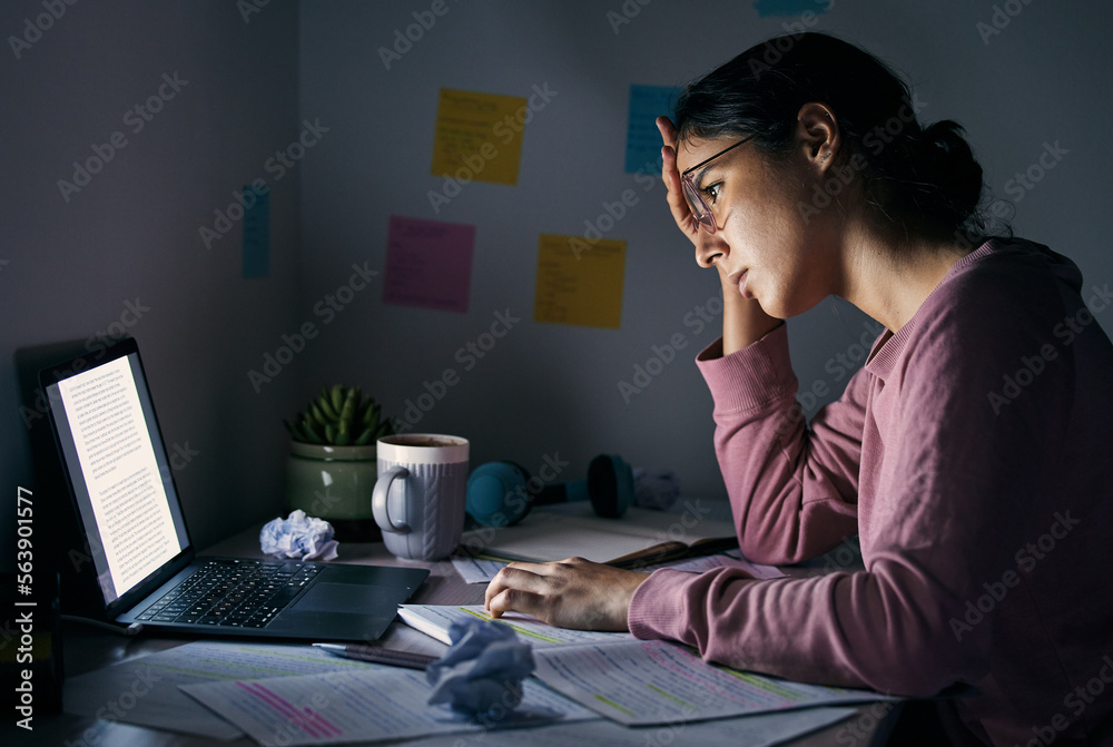 Laptop, night and tired with a student woman learning or studying in her home for a university exam. Computer, exhausted and late with a female pupil in a house to study for her college scholarship
