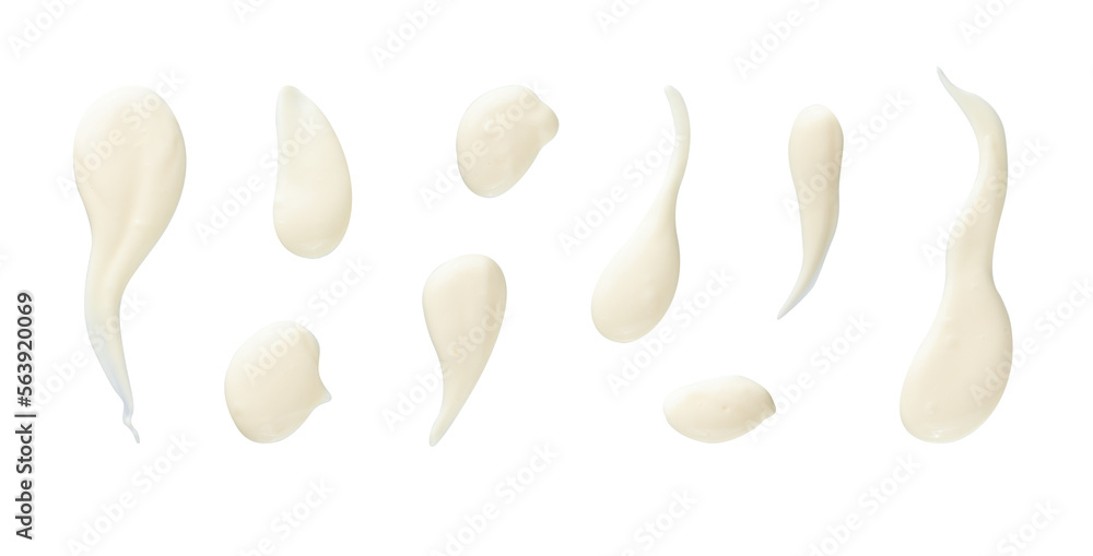 Set of white drops and splashes of mayonnaise or cream sauce isolated on white background. With clipping path. Full depth of field. Focus stacking. PNG