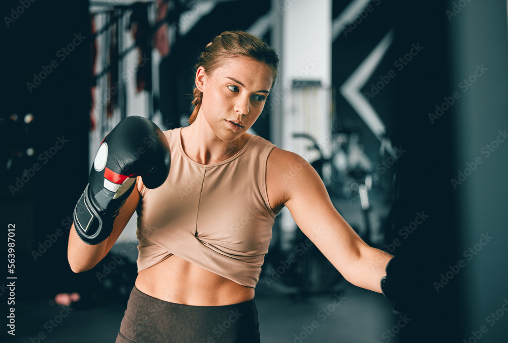 Fitness, sports and boxing with woman in gym for training, workout and mma challenge. Performance, energy and power with girl boxer and focus for fight, wellness and exercise in martial arts class