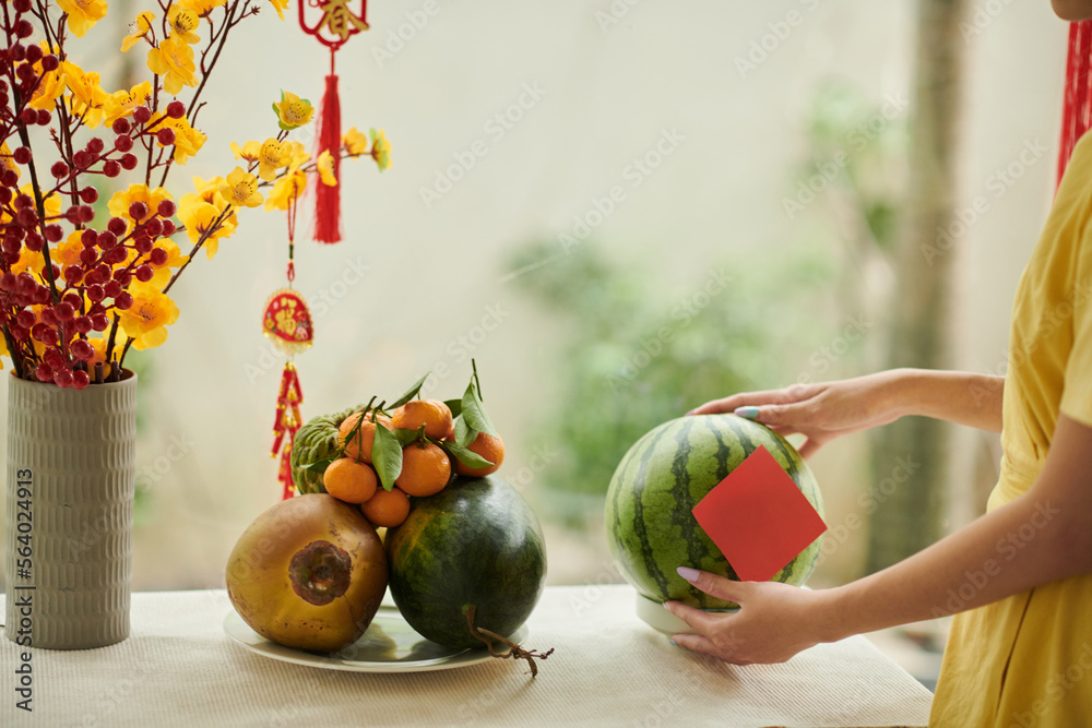 Plates with delicious fruits and vase with peach and apricot branches on window sill