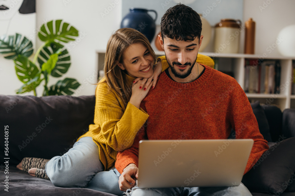 Young caucasian couple looking at the laptop screen