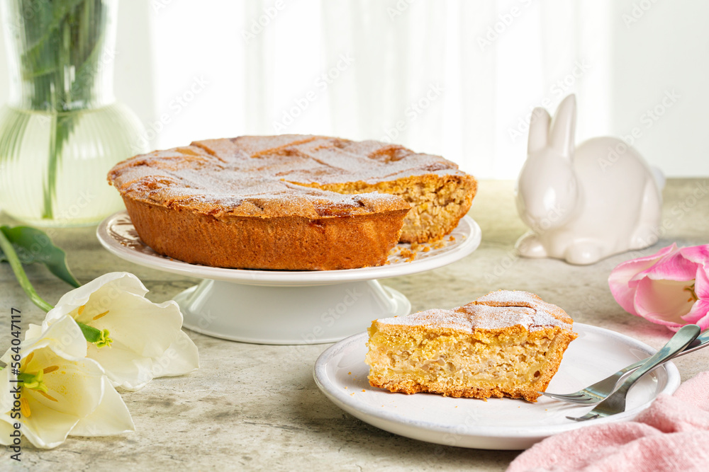 Italian Easter cake. Pastiera Napoletana. Traditionally made with pre-cooked wheat grains, grano cotto, ricotta cheese and orange flower water. Easter table.