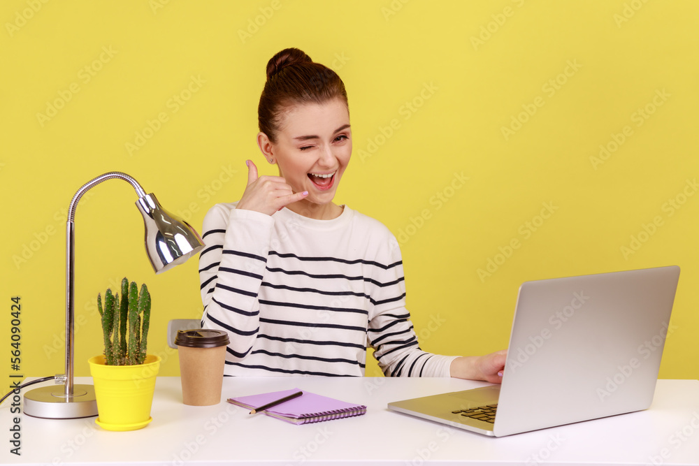 Call me. Beautiful lovely young woman employee sitting at workplace with laptop keeping hand shaped like telephone near head. Indoor studio studio shot isolated on yellow background.