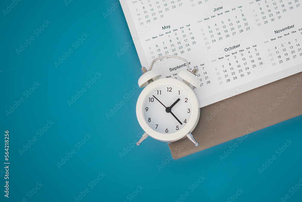 white analog alarm clock on blurred yearly calendar with grunge blue background with copy space, business meeting schedule, travel planning or project milestone and reminder concept