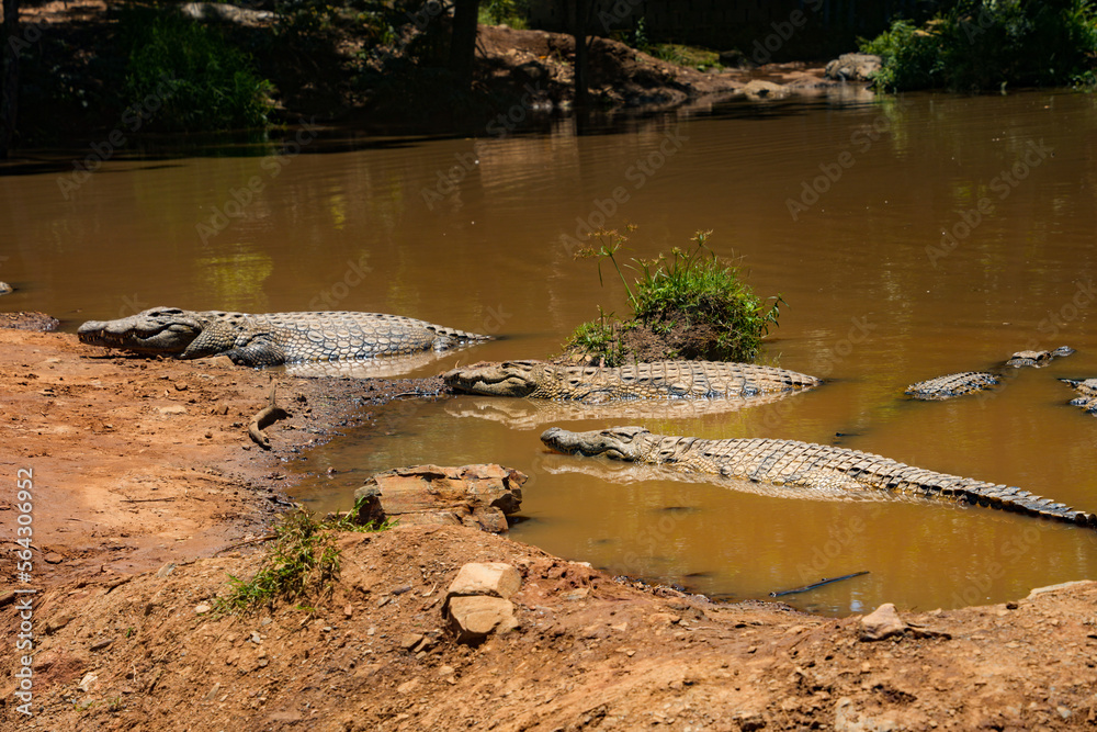 A float of crocodiles that is half submerged in water near the bank of a muddy river.