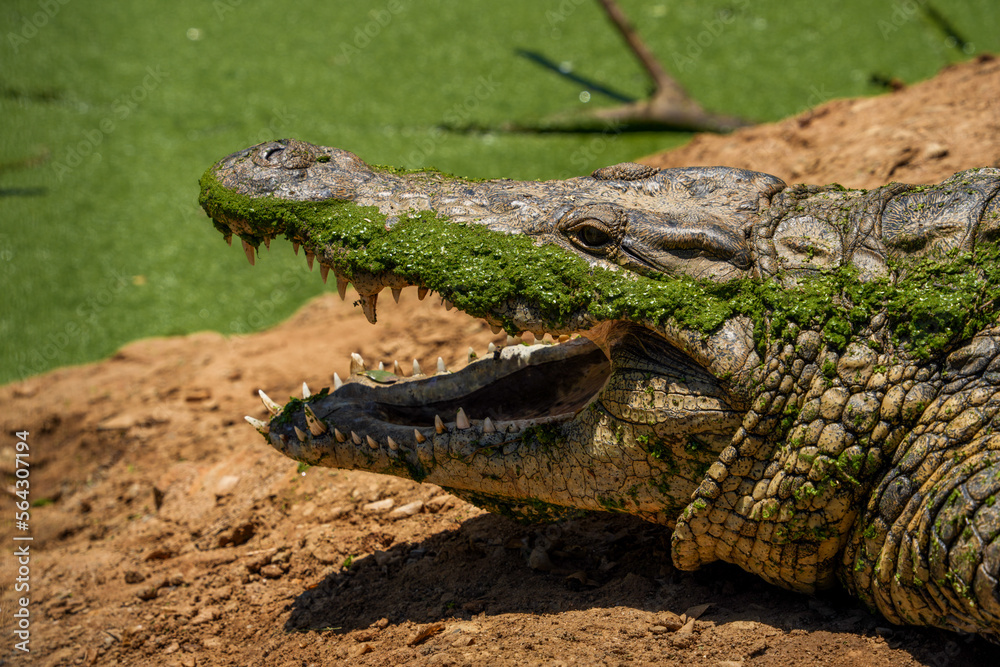 A close-up of the fearsome open mouth of a Nile crocodile. The top of the crocodile's mouth is covered with green algae.