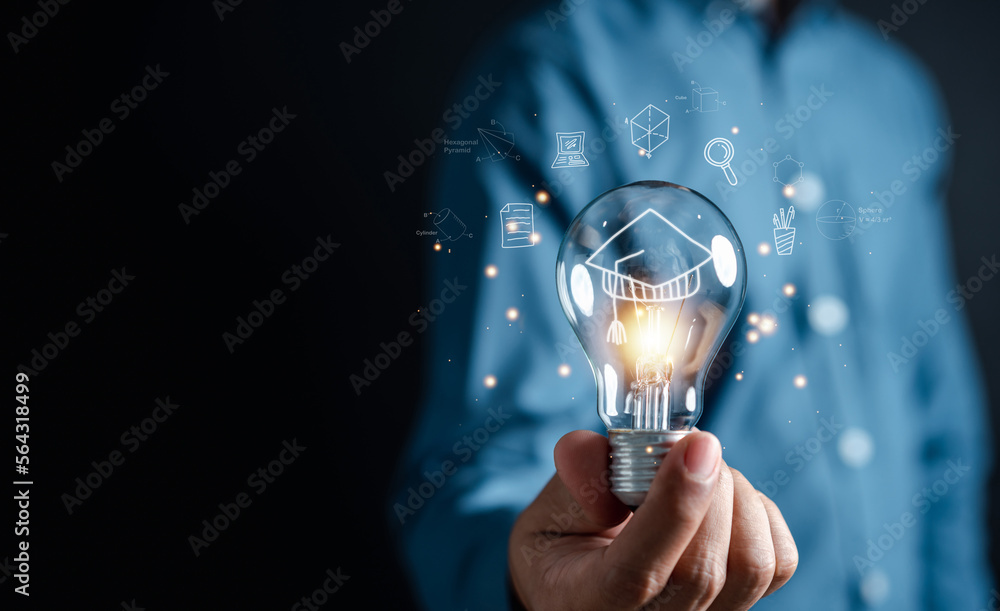 Man hand holding lightbulb with learning educate and graduation concept. study knowledge to creative thinking idea and problem solving solution, E-learning online education course degree certificate