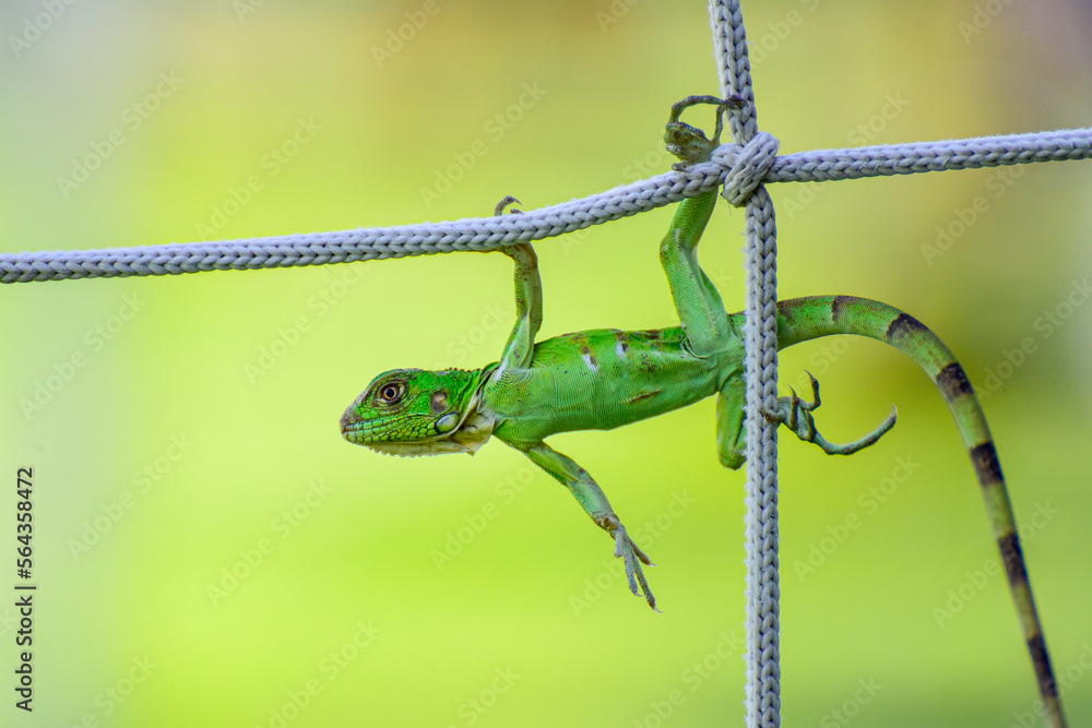 Una iguana bebé cuelga de la red de un arco de fútbol