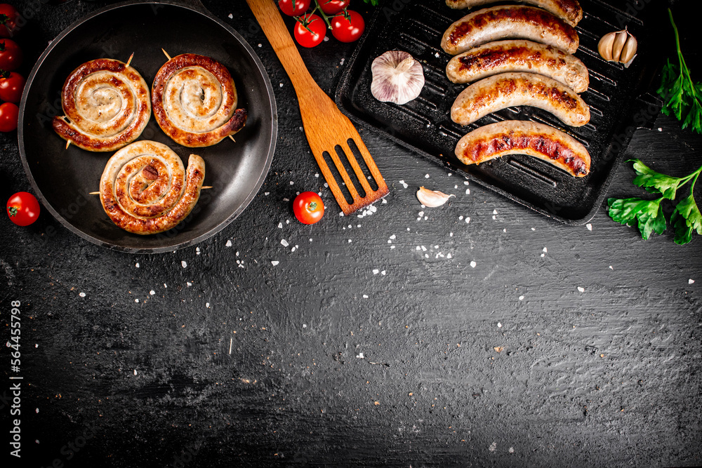 Delicious grilled sausages in a frying pan with fresh tomatoes.