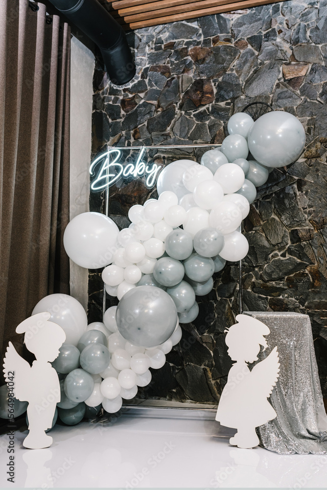 Birthday decorations - arch, balloons, and decor for little baby party on a wall background. Celebration baptism concept. Baby text. Photo zone with angel for babe shower. Photo area in silver style.
