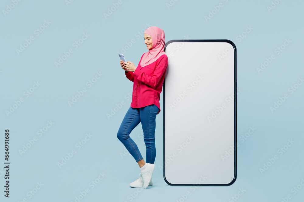 Full body young arabian muslim woman wear pink abaya hijab near big huge blank screen area use mobile cell phone isolated on plain pastel light blue cyan background People uae islam religious concept