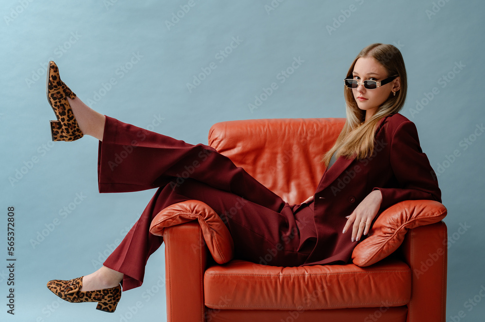 Fashionable confident woman wearing elegant marsala color suit, sunglasses, leopard print loafer shoes, posing, sitting in brown leather armchair. Studio fashion portrait. Copy. empty space for text