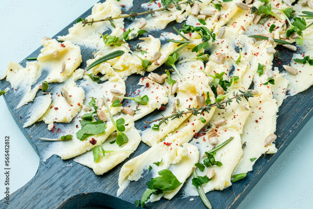 Wooden board with butter and herbs with seeds smeared on it, close-up.