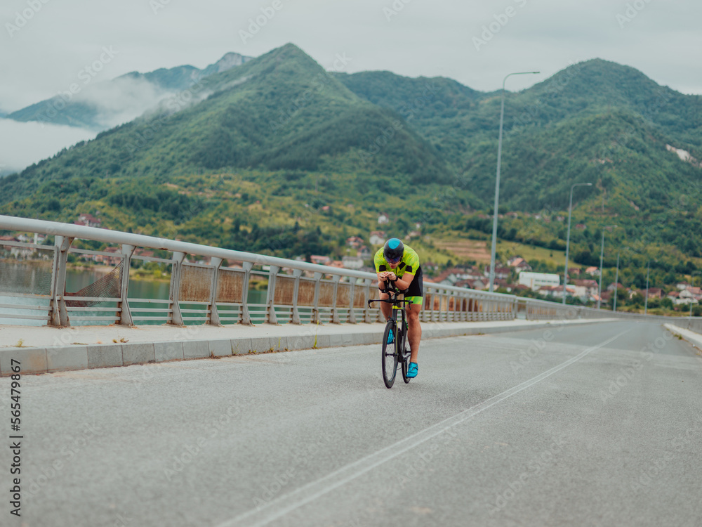 Full length portrait of an active triathlete in sportswear and with a protective helmet riding a bicycle. Selective focus