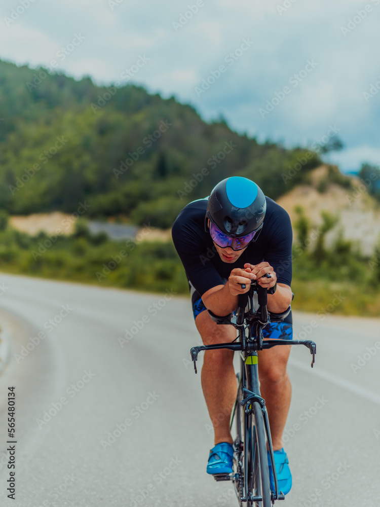 Full length portrait of an active triathlete in sportswear and with a protective helmet riding a bicycle. Selective focus