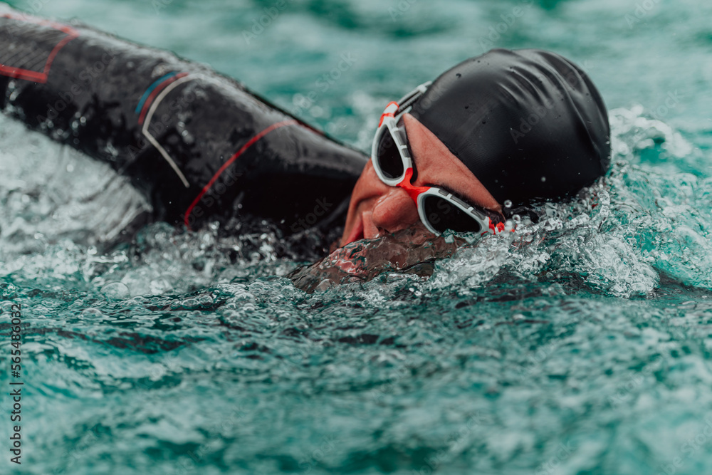 A triathlete in a professional swimming suit trains on the river while preparing for Olympic swimming